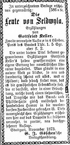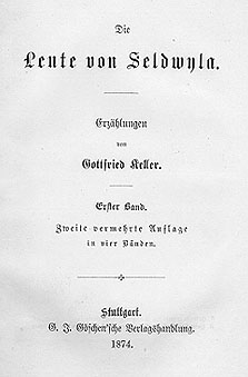Der erste Teil der Leute von Seldwyla erschien erschien Anfang 1856 einbändig im Verlag Vieweg in Braunschweig, der auch den Grünen Heinrich verlegt hatte. Obwohl Keller schon 1855 eine Fortsetzung ins Auge gefaßt hatte, dauerte es fast zwanzig Jahre, bis die zweite, um fünf Erzählungen vermehrte Auflage in vier Bänden bei Ferdinand Weibert (Göschen-Gerlag) in Stuttgart erscheinen konnte. Der Zyklus ging 1889 als Band 4 und 5 in die Gesammelten Werke ein. Ein Teil der neuen Erzählungen war schon in den Jahren vor Antritt des Staatsdienstes, also vor dem Sommer 1861 entstanden, wurde aber später noch überarbeitet, teilweise - wie Der Schmied seines Glückes - sehr eingreifend. Das übrige sammelte sich, von jahrelangen Pausen unterbrochen, erst nach und nach an. Anfang Dezember 1873 lagen die ersten drei Bände vor. Im Dezember 1874 konnte dann auch der vierte Band mit Dietegen und Das verlorene Lachen erscheinen. |
